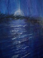 I once lived in a cottage by a lake, and some nights I would walk down to the water to watch the moon rise over the hills on the far shore. This is what I'm remembering, not a literal rendering, but an abstract memory. - Nancy BoudreauThe painting is 3' x 4' on stretched cotton duck canvas, the upper portion of the painting is sealed with matte clear acrylic, while the lower portion is sealed with high gloss.The painting was started by building a lively substrate of brushstrokes resembling roiling water. Over this, many transparent layers of color were applied using a 4" roller. The paint was thinned with a substance which caused it to foam, creating color that pooled into tiny dots and running streaks, suggesting flowing water.