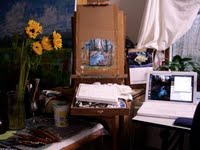 Late afternoon in November, hiking through Walter G. Merritt Park in Patterson, New York. Here on the east facing hillside everything is in shadow, bathed in a dim blue light. As the light wanes, the damp chill increases. The cold seeps inward. Hills in the distance reflect the low angled sun and I am reminded of how dependent we are on this single source of heat and light. How cold would a sunless world be?I've included a photo of the painting in the studio this morning, so that you can see it in situ. Sunflowers from a friend and an earlier painting brighten my working space. Brushes and computer, a french easel with it's legs tucked up out of the way, these are my tools. Music is my studio companion, a mix provided by Pandora Radio and gotradio.com.